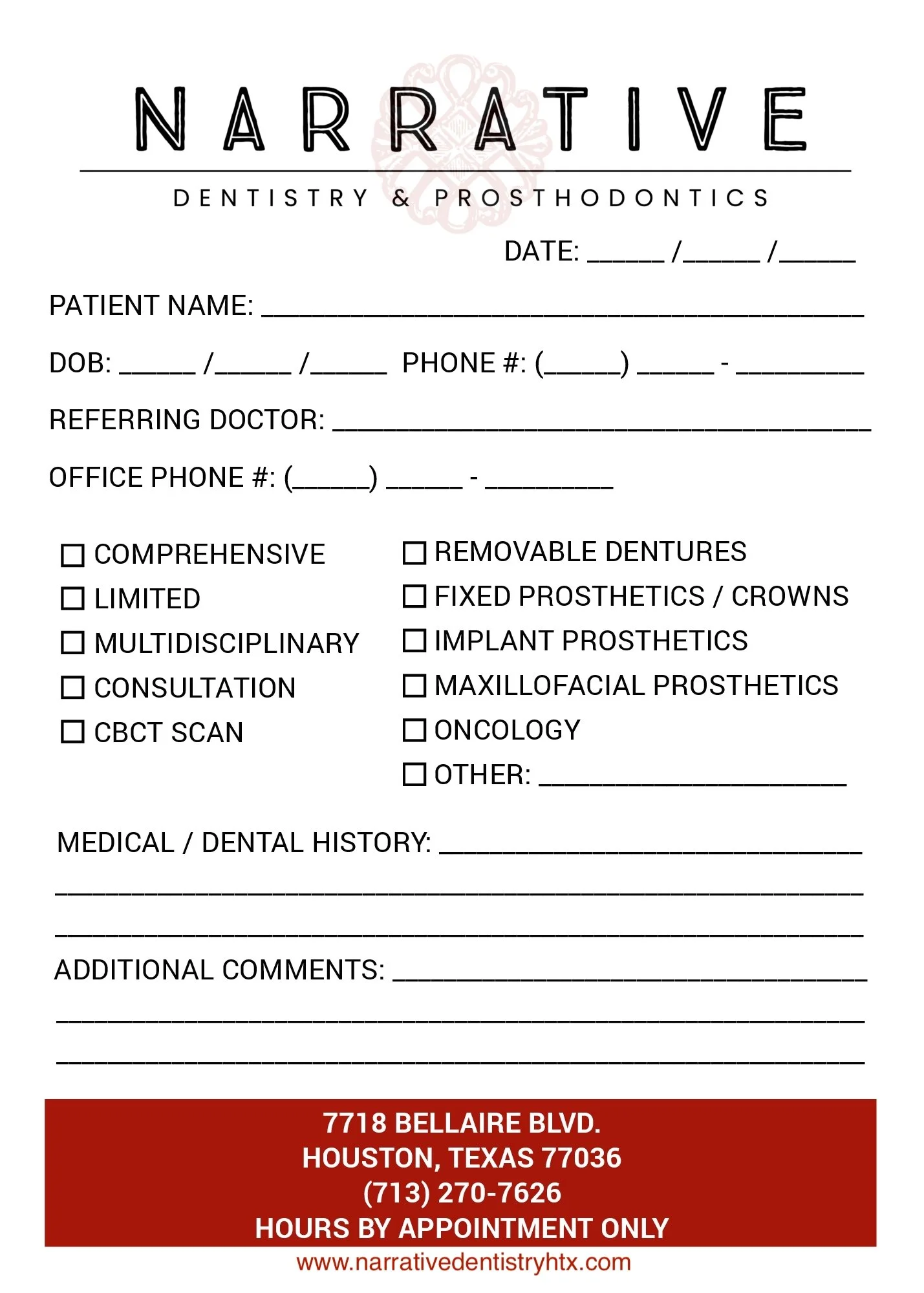 Print a paper copy of the referral form, & fill out all the necessary information. Advise the patient contact us to schedule an appointment. Please remind the patient to bring the referral form to our office.